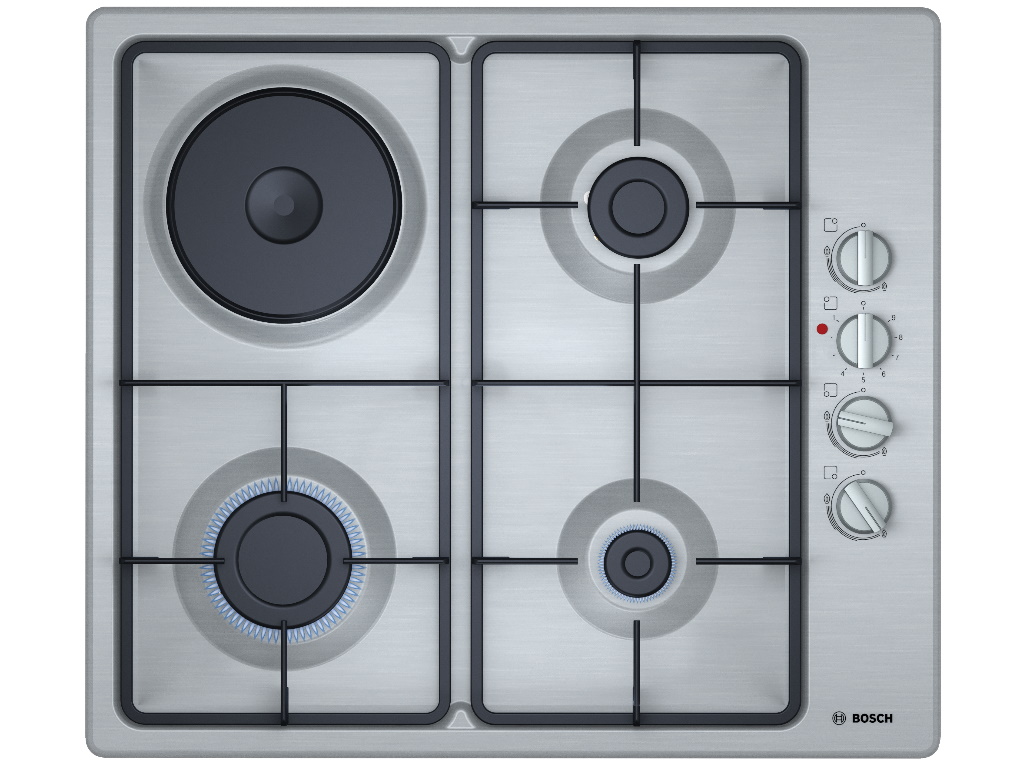BOSCH Kombinovana ploča 3/1 (plin/struja) PBY6C5B62O Serie 2|; 60 cm; Mehaničke kontrole; jednoručno paljenje; Nehrđajući čelik ; Dizne za zemni plin (20 mbar); Priložene mlaznice za tekući plin (28-30/37 mbar); TR