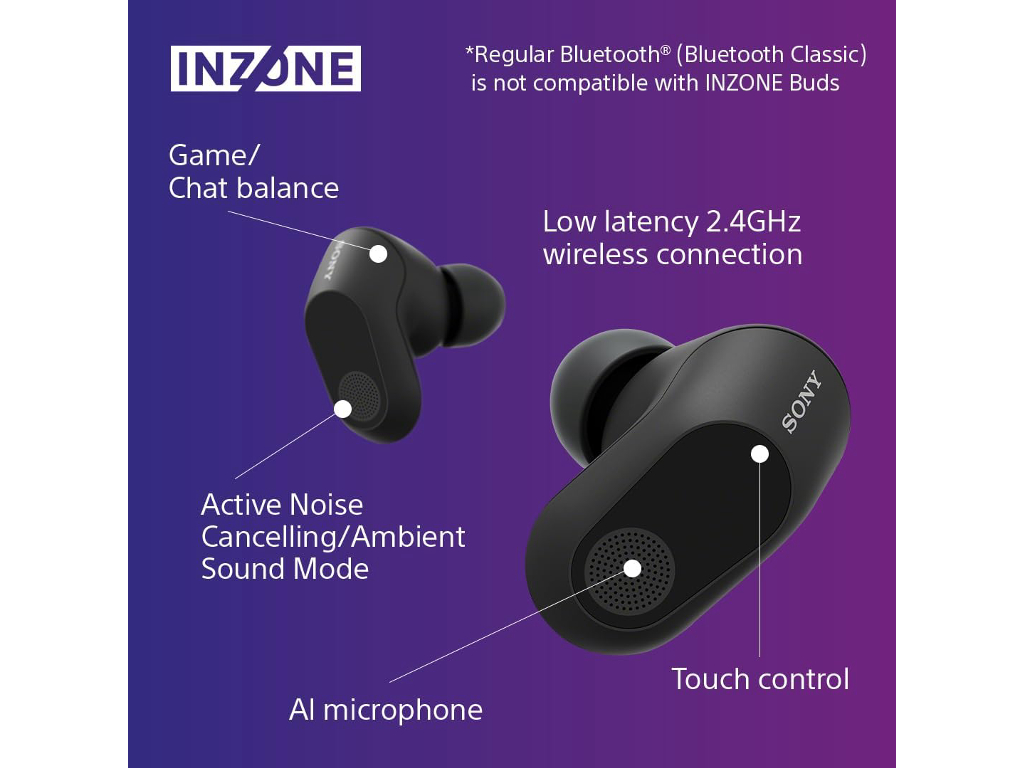 Sony gaming slušalice BT INZONE buds; bežične; 360 Spatial Sound; low latency; aktivna blokada buke; 24h baterija; AI mikrofon; boja crna