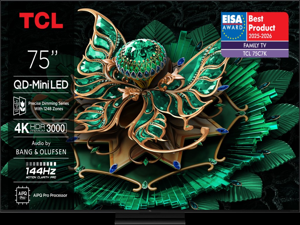 TCL 75”C7K 4K QD-Mini LED TV; 144Hz Google TV; Crystglow HVA Panel; Game Master; Audio Bang & Olufsen; Motion Clarity Pro; HDR Premium; HDR10+ HDR10 HLG; Netflix Youtube Amazon Prime Apple TV; Chromecast & T-cast; HDMI: 4x 2.1; USB: 1x 3.0;